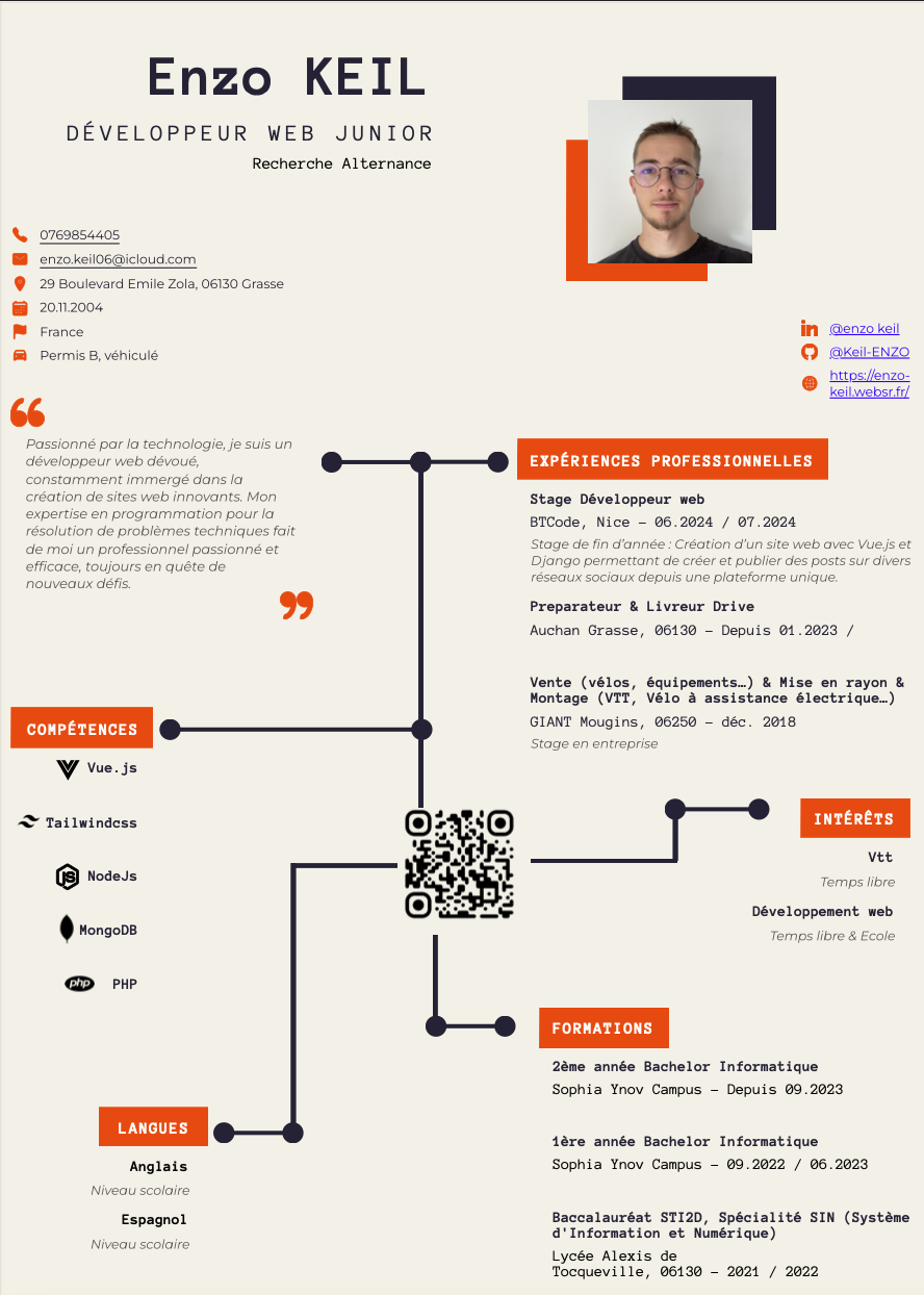 Bonjour tout le monde, je m’appelle KEIL Enzo, étudiant en troisième année de Bachelor année de Bachelor en informatique à l’école Sophia Ynov Campus. Je suis quelqu’un de très déterminé dans ce que je fais avec une envie de toujours en apprendre plus. Je suis passionné par le développement web depuis maintenant trois ans et j’envisage d’en faire mon métier dans les prochaines années. Mon intérêt pour le métier de développeur web a commencé lors d’une discussion avec un membre de ma famille, développeur web frontend depuis huit ans.